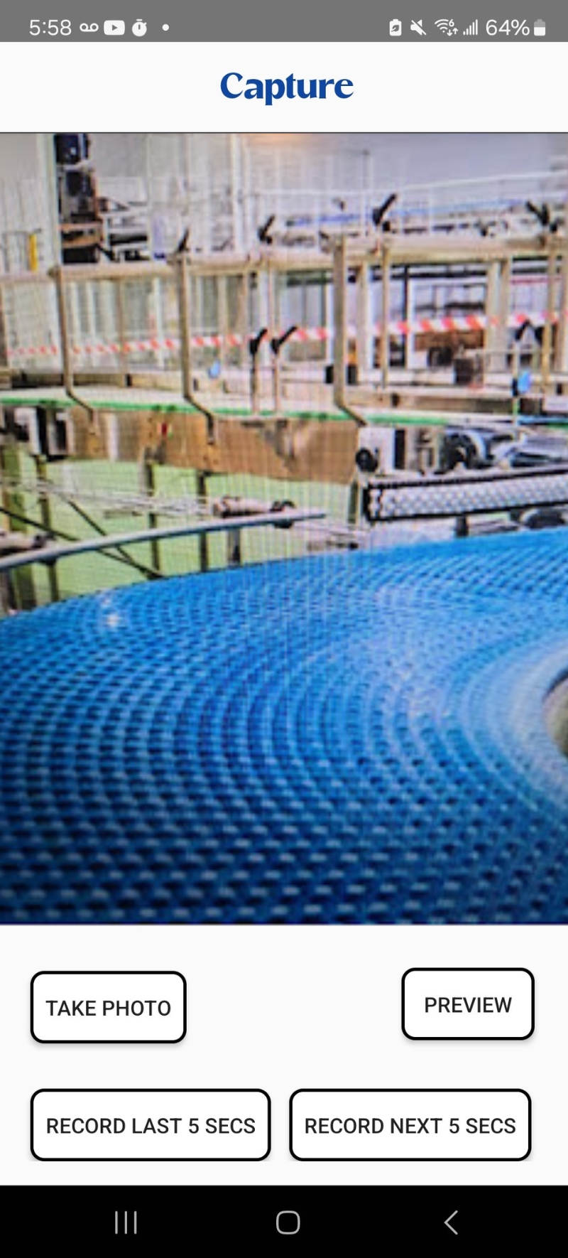 Machine Monitors continuously buffers live camera video. When an issue occurs, tap one button to save the moments before and during the malfunction — stored directly on the device.